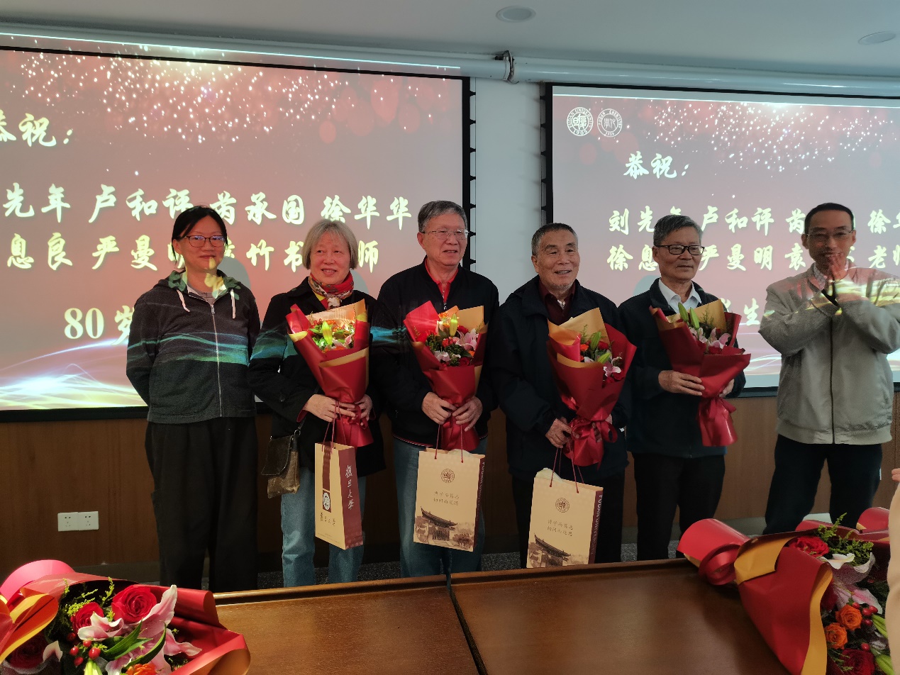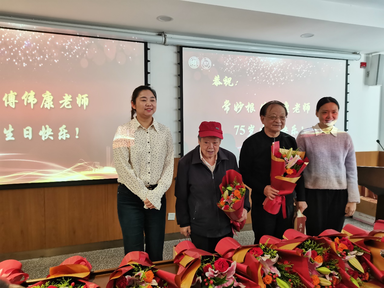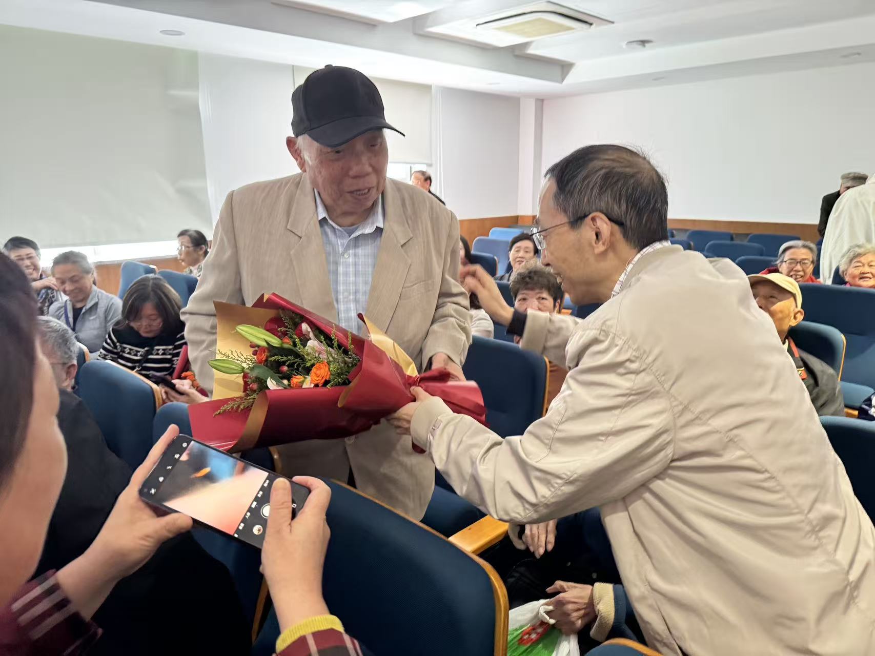 集体祝寿环节温馨满溢。化学系现有离退休教师140余位,今年 “逢五逢十” 的寿星共32位。在全场热烈掌声中,马蔚纯、秦枫、王文宁三位系领导为寿星代表送上鲜花与礼品,并送上了美好祝愿。寿星代表郁祖湛老师、朱自刚老师动情发言,感谢化学系的精心筹备,并祝愿老同志们身体健康、阖家幸福。