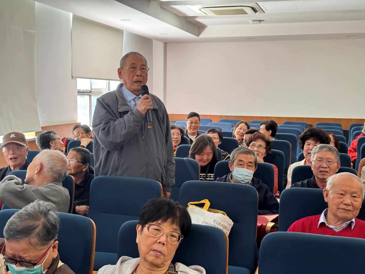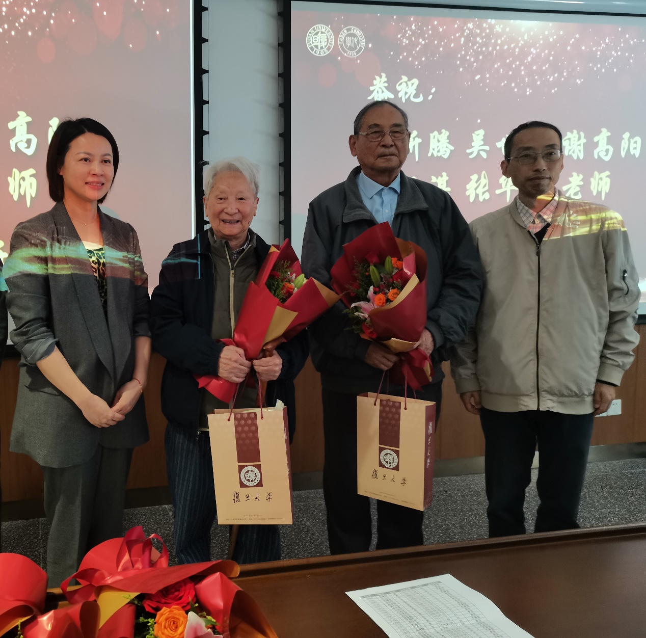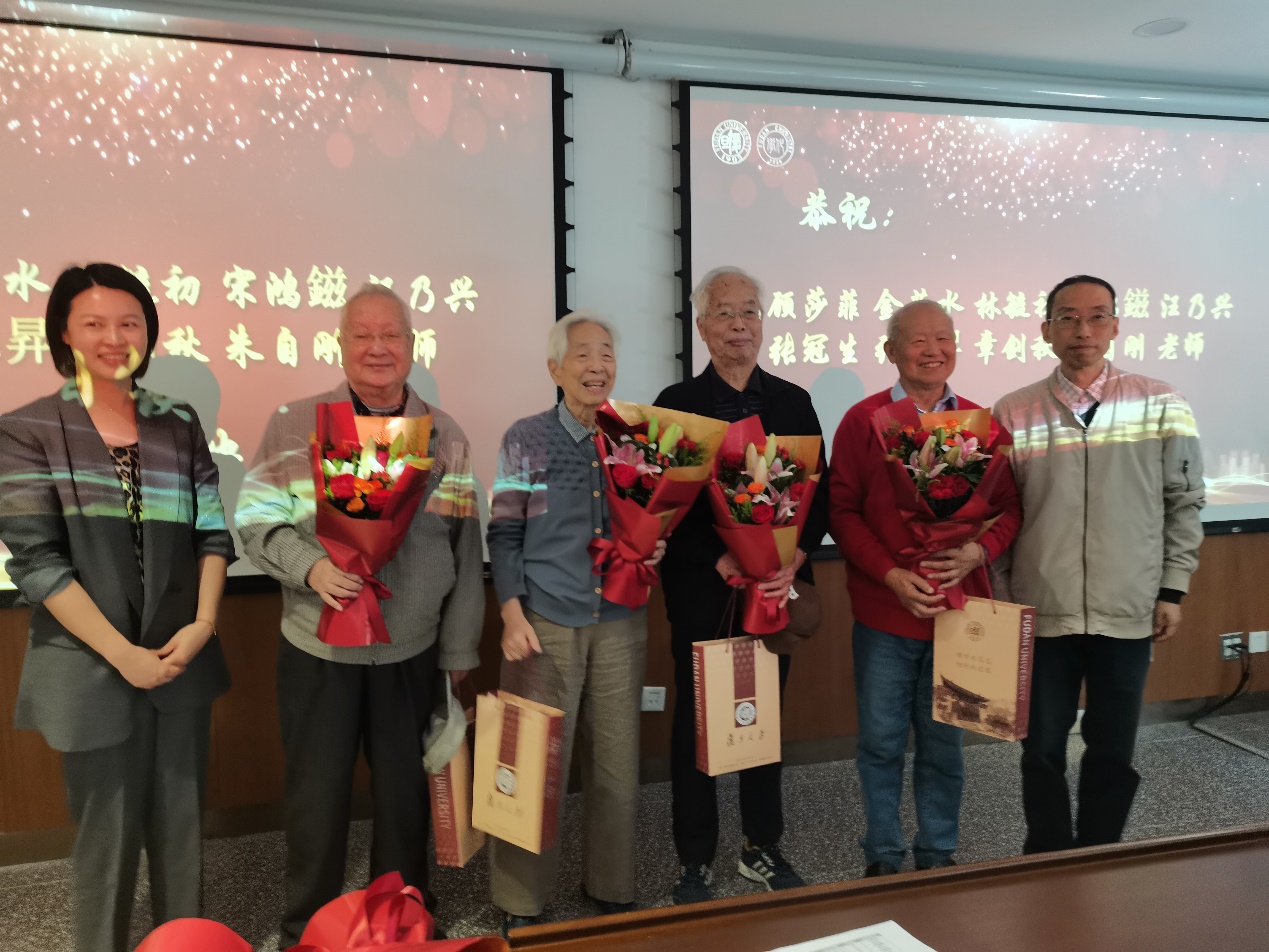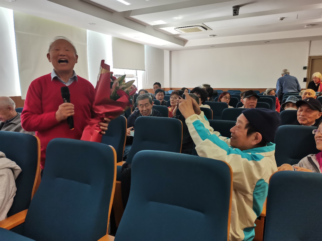 集体祝寿环节温馨满溢。化学系现有离退休教师140余位,今年 “逢五逢十” 的寿星共32位。在全场热烈掌声中,马蔚纯、秦枫、王文宁三位系领导为寿星代表送上鲜花与礼品,并送上了美好祝愿。寿星代表郁祖湛老师、朱自刚老师动情发言,感谢化学系的精心筹备,并祝愿老同志们身体健康、阖家幸福。
