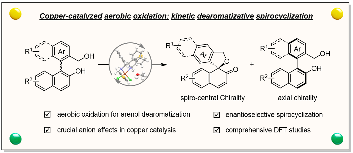近日,化学系朱灿课题组发展了一种新型的空气氧化体系:以氧气作为终端氧化剂,阴离子辅助铜/手性二胺催化轴手性萘酚发生动力学去芳构化螺环化转化,同时高效获得光学活性的轴手性苄醇与手性氧杂螺环化合物,去芳构化转化展示了良好的对映选择性。