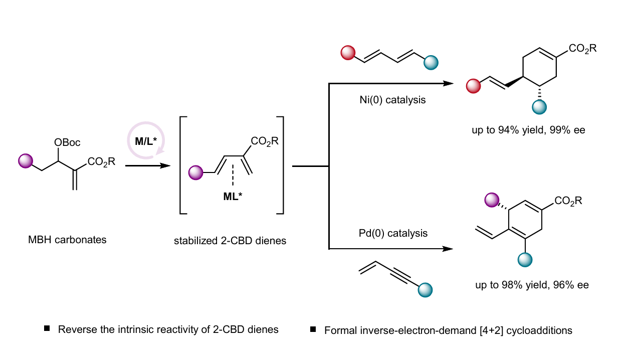 近日,复旦大学化学系蔡泉课题组发展了配位稳定/促进环化策略,首次实现了这一转化。研究团队利用简单易得的Morita–Baylis–Hillman碳酸酯为双烯前体,在Ni(0)/手性单膦配合物催化下,原位生成不稳定2-酯基-1,3-丁二烯,并利用低价镍金属催化剂的配位作用稳定二烯,随后与外加1,3-共轭二烯发生选择性氧化环金属化及还原消除反应,以优异的化学选择性、区域选择性、及立体选择性成功实现了一系列对位取代环己烯类衍生物的高效合成。该策略可进一步拓展至钯催化体系,实现了Morita–Baylis–Hillman碳酸酯与1,3-烯炔的不对称形式反电子需求[4+2]环加成反应。在该反应中,1,3-共轭烯炔的炔烃区域选择性地发生反应,从而为多取代手性 1,4-环己二烯衍生物的不对称高效合成提供全新方法。以该反应为关键步骤,研究团队以三步反应实现了保幼酮和表保幼酮的简洁不对称合成。机理实验及密度泛函理论计算研究表明,反应经历了分子间[4 + 4 + 1]型氧化环金属化过程及还原消除反应机制。