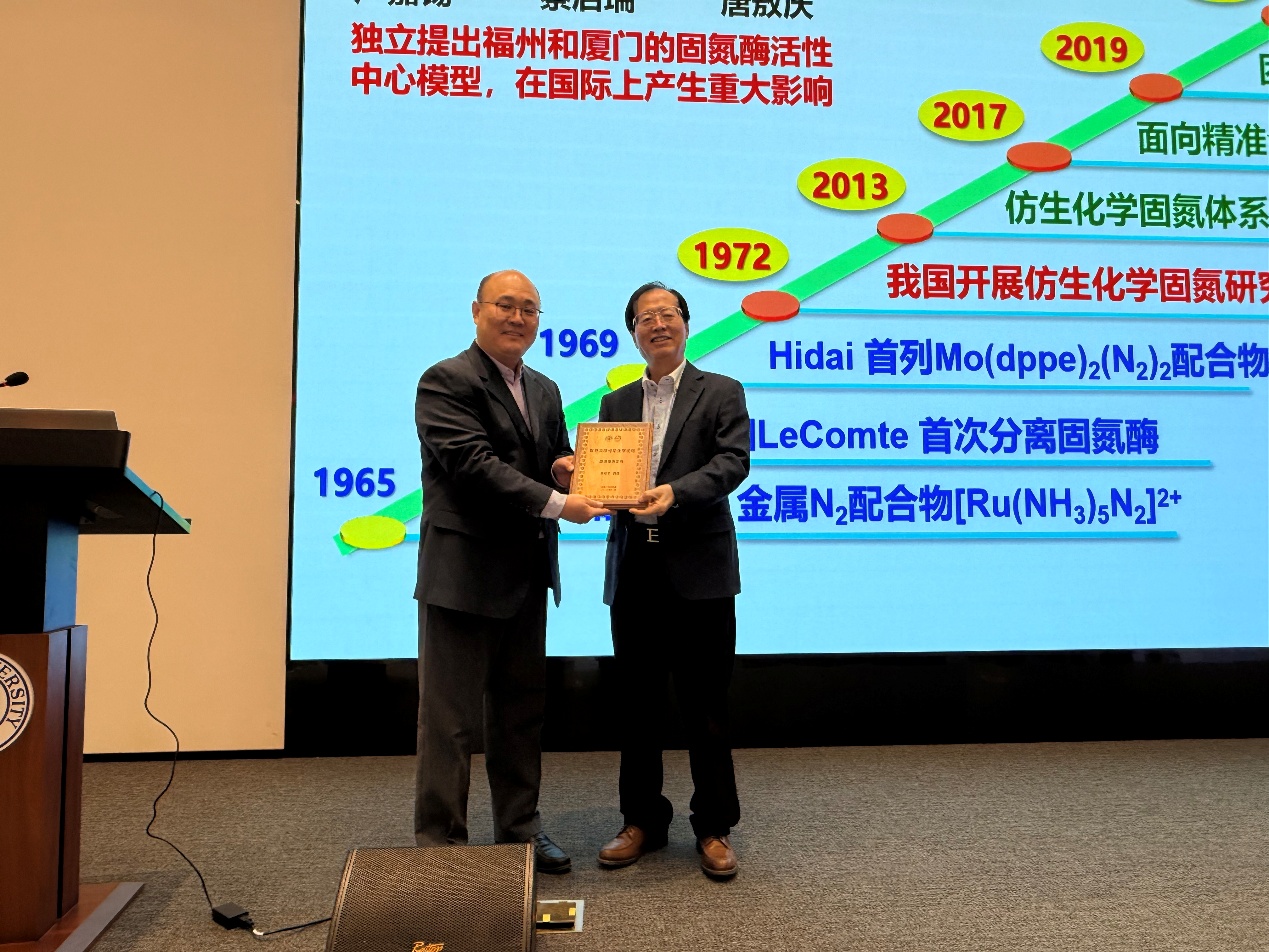 曲景平教授围绕工业合成氨这一重要的化学成就,系统介绍了合成氨工业的发展历程,以及国内外仿生化学与配位化学固氮研究的历史脉络与研究现状。报告以生物固氮酶的功能与结构特征为切入点,针对氮气结合位点与还原路径尚存争议等关键科学问题,提出并重点阐述了双金属中心的研究策略,从探索、提升和深化三个层面全面总结了其团队二十余年来在仿生固氮领域取得的研究进展。从仿生化学视角深入解析固氮酶在温和条件下活化与转化氮气的作用机理,系统介绍了新型硫桥联双核铁配合物固氮酶模拟物的设计、合成及仿生固氮功能实现,为从分子层面理解固氮酶还原机制及发展高效温和条件下的仿生氮还原催化剂提供了新的思路与策略。